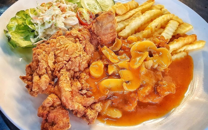 Chicken chop + fries + salad + mushroom sauce